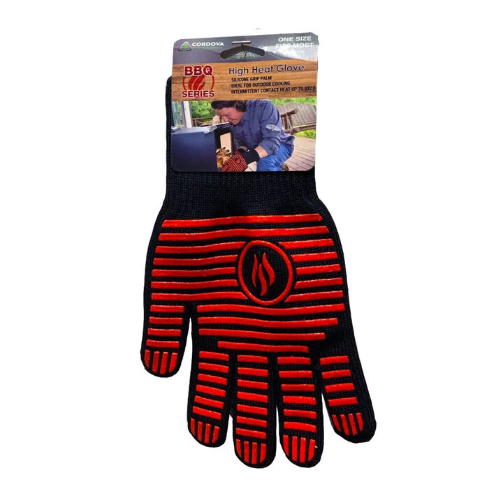 Ideal for outdoor cooking, the High Heat Glove offers triple layer heat protection – silicone power grip, thick heat-resistant machine knit shell, comfortable cotton / poly inner liner.